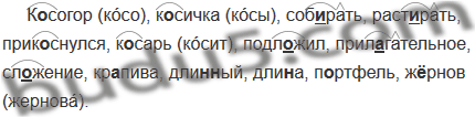 К..согор, к..сичка, собирать, растирать, прик..снул ся, к..сарь, подл..жил, прил..гательное, сл..же ние, кр..пива, дли(н, нн)ый, дли(н, нн)а, п..ртфель ж..рнов.